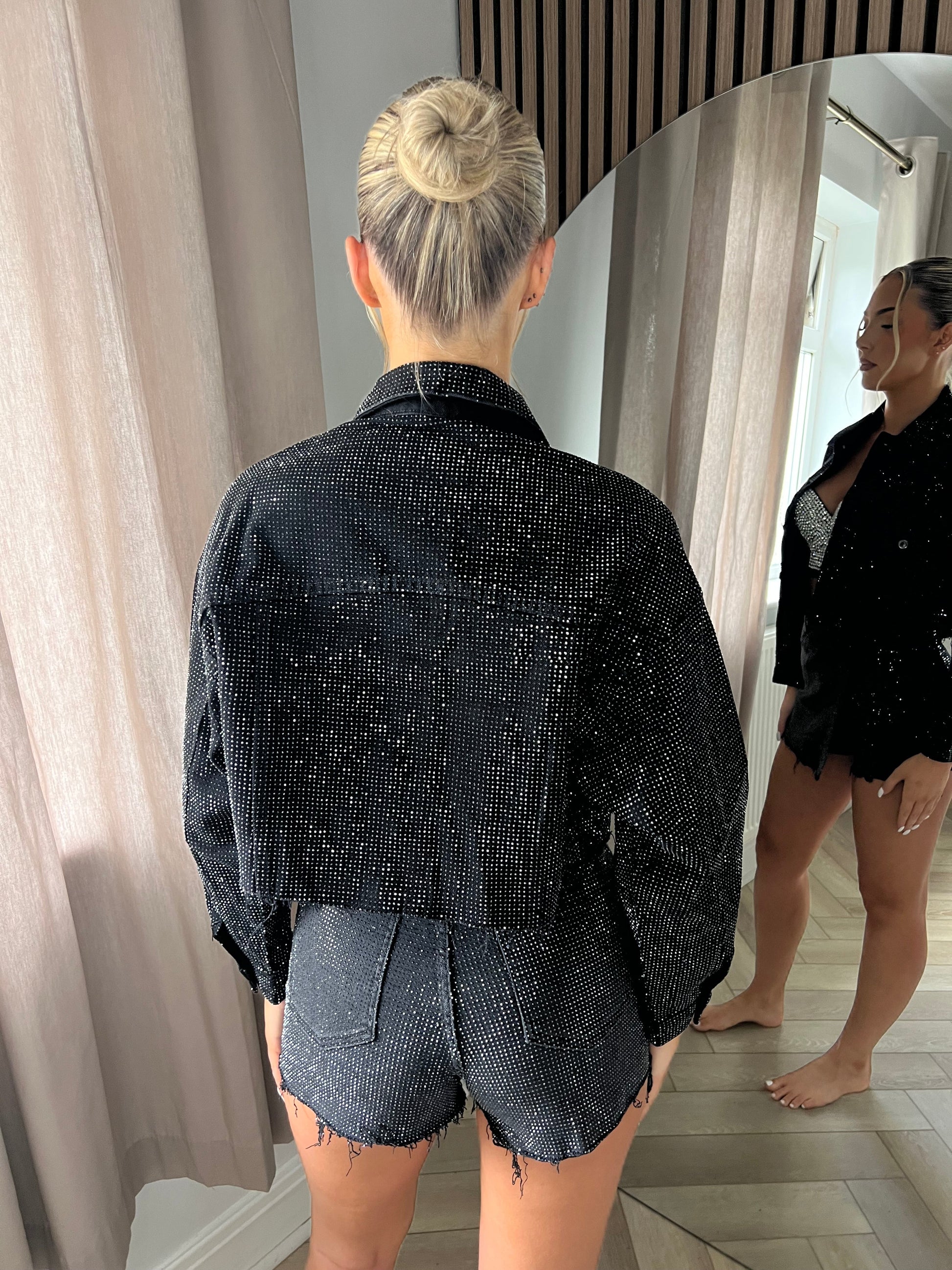 Turn up the sparkle with this brand new, stunning black jean jacket, fully embellished with rhinestones from front to back. Eye-catching and glamorous, it’s the perfect statement piece for any wardrobe. Designed to pair flawlessly with our Black Wide Leg Jeans for a coordinated, head-turning look.