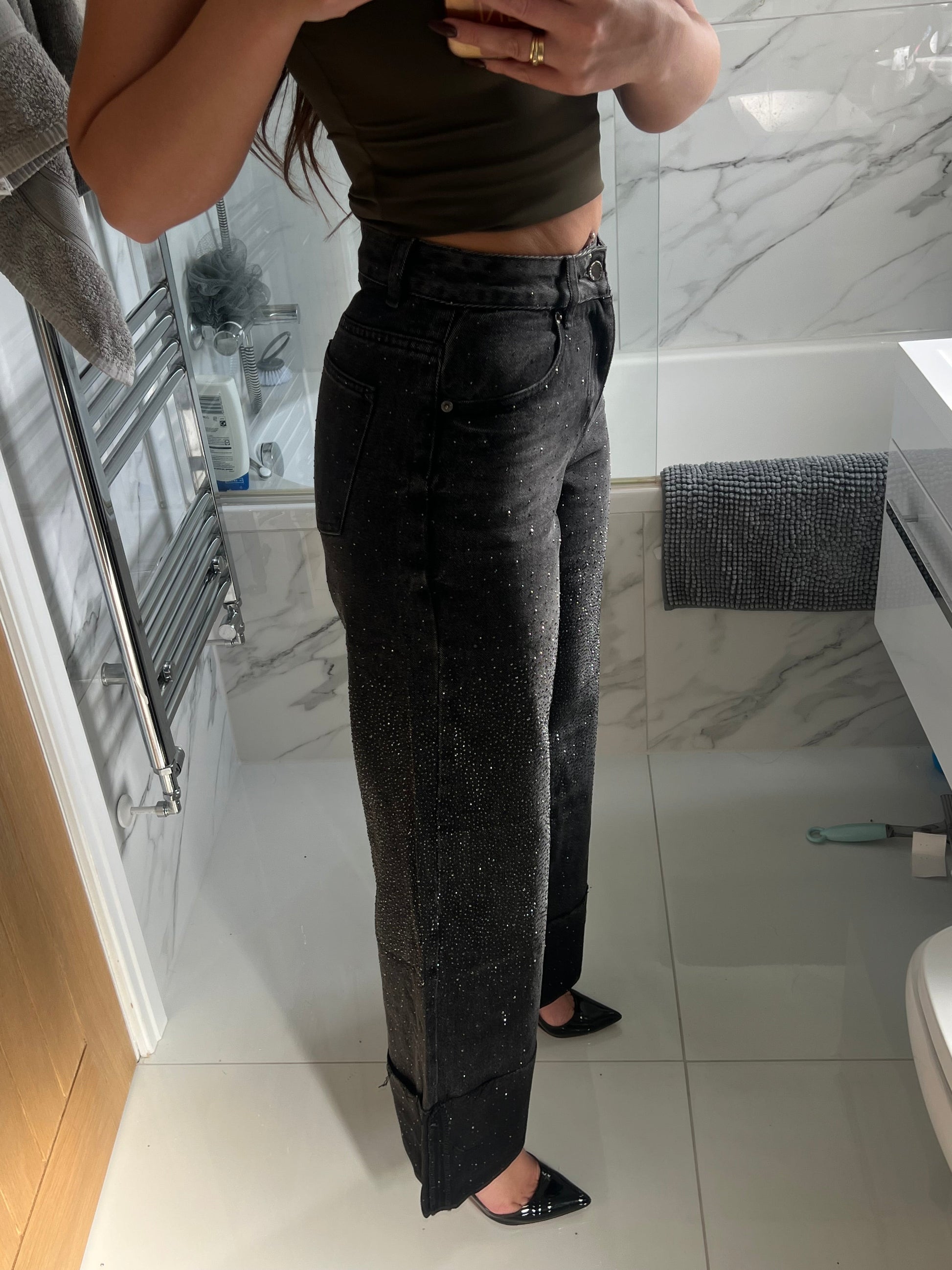Dark Grey Folded Hem Diamanté Jeans