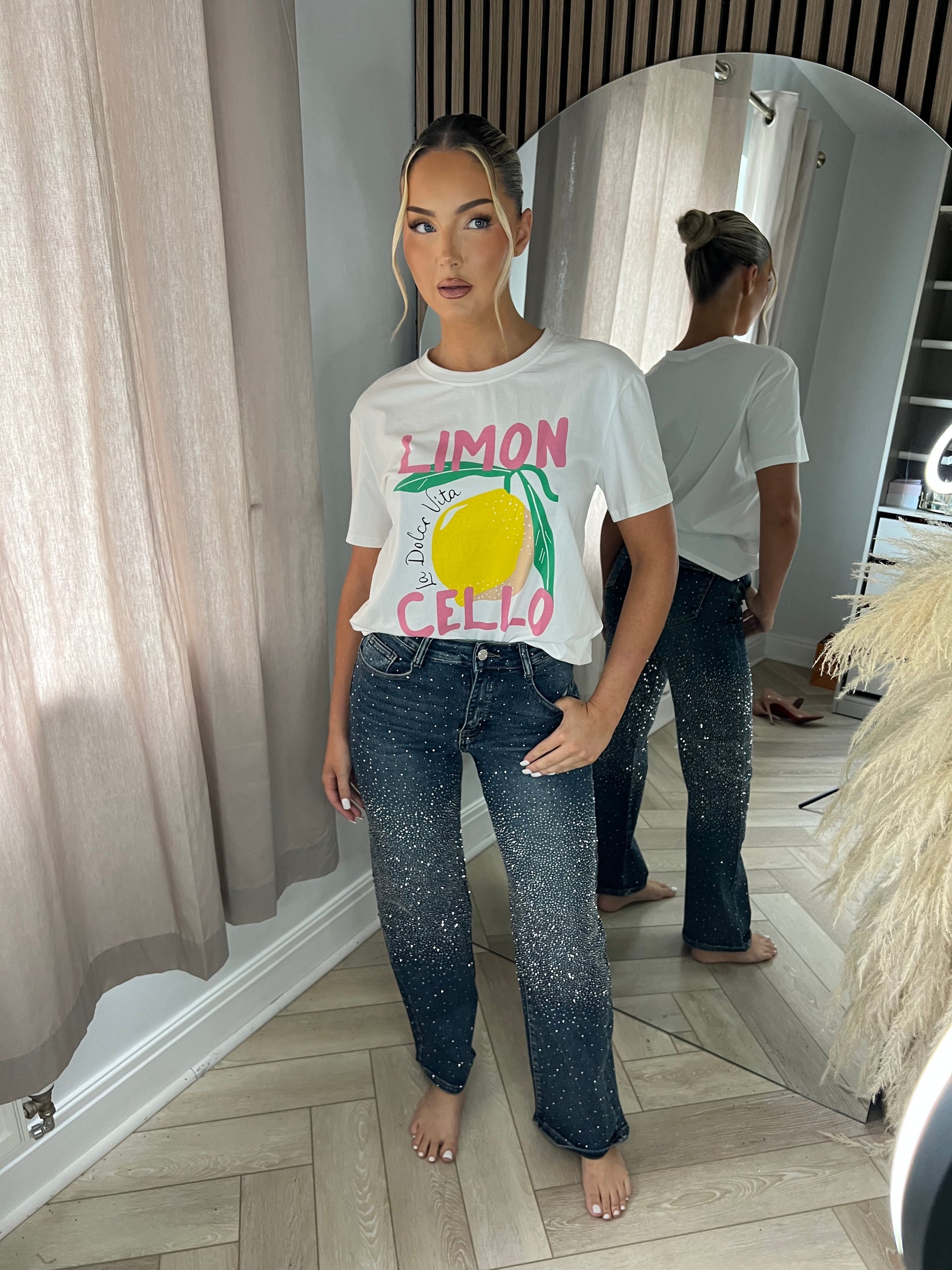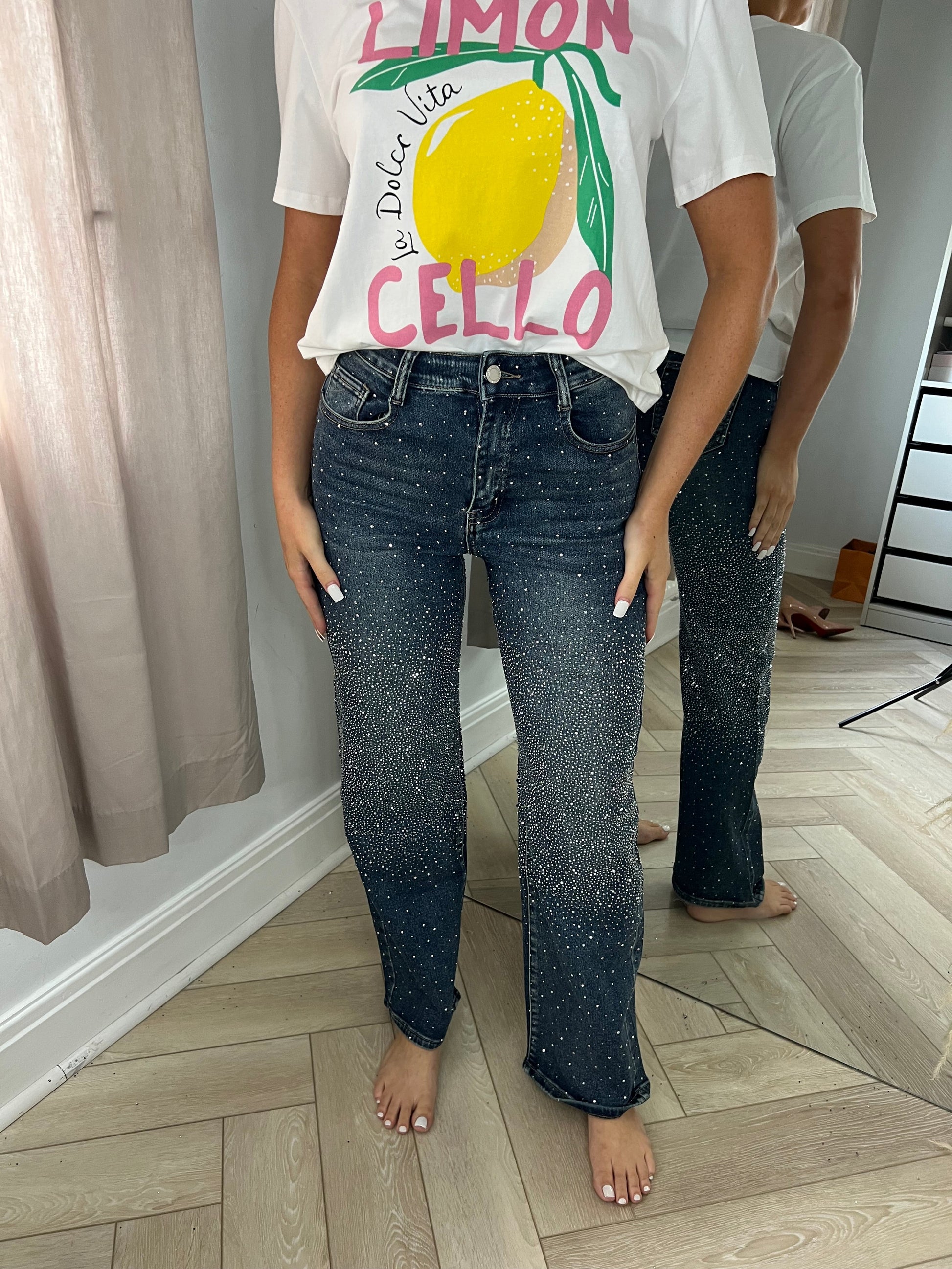 Own the Moment in Our Petite Dark Blue Wide Leg Silver Diamanté Jeans